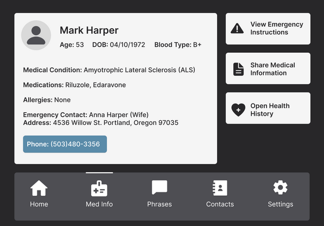I designed Respondr for people living with ALS, a progressive disease that gradually takes away the ability to speak and move. Most AAC apps aren't built around what ALS patients actually experience day to day. Respondr is a tablet-based emergency communication app that makes critical actions available in one tap, gives first responders instant access to medical information, and automatically alerts emergency contacts, all designed around users with limited motor control.