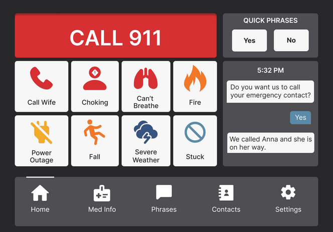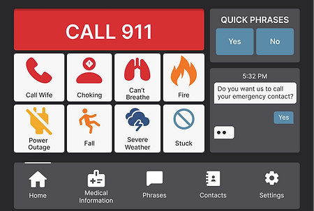Every decision was made around one question: What does a person with limited motor control need in a moment of crisis? The CALL 911 button is the largest, most dominant element on screen at all times. The Quick Phrases panel keeps Yes and No permanently visible without any navigation. The Emergency Detected screen is full-screen red, no clutter, no confusion, just two large actions. And rather than a static alert, the app walks through a conversational confirmation flow so the user always knows help is actually on the way. Button sizes were also deliberately designed to be large throughout, accounting for users with limited dexterity.